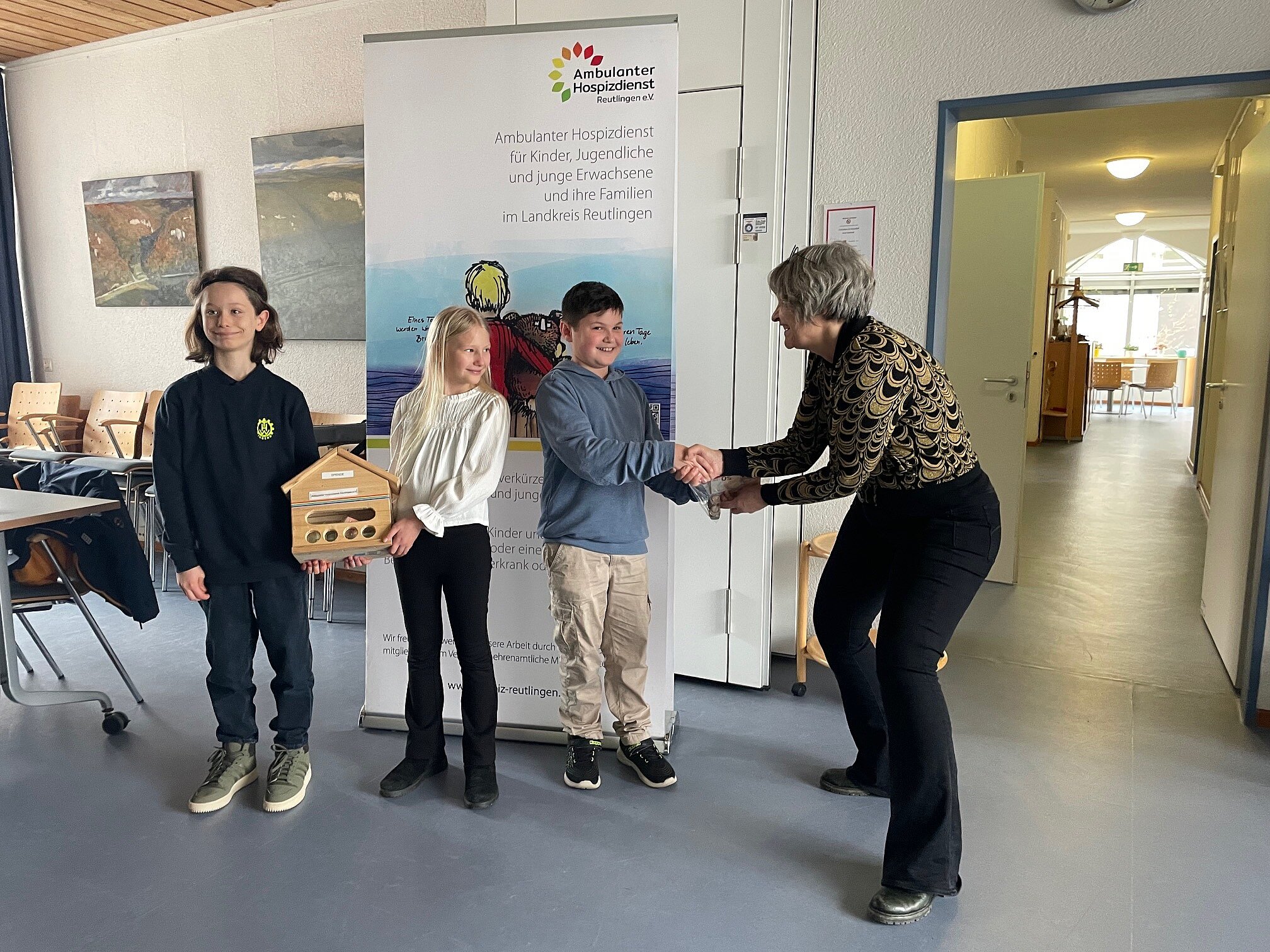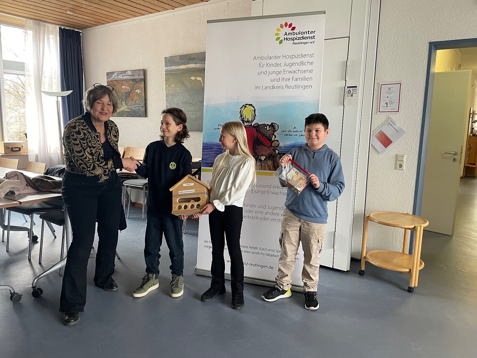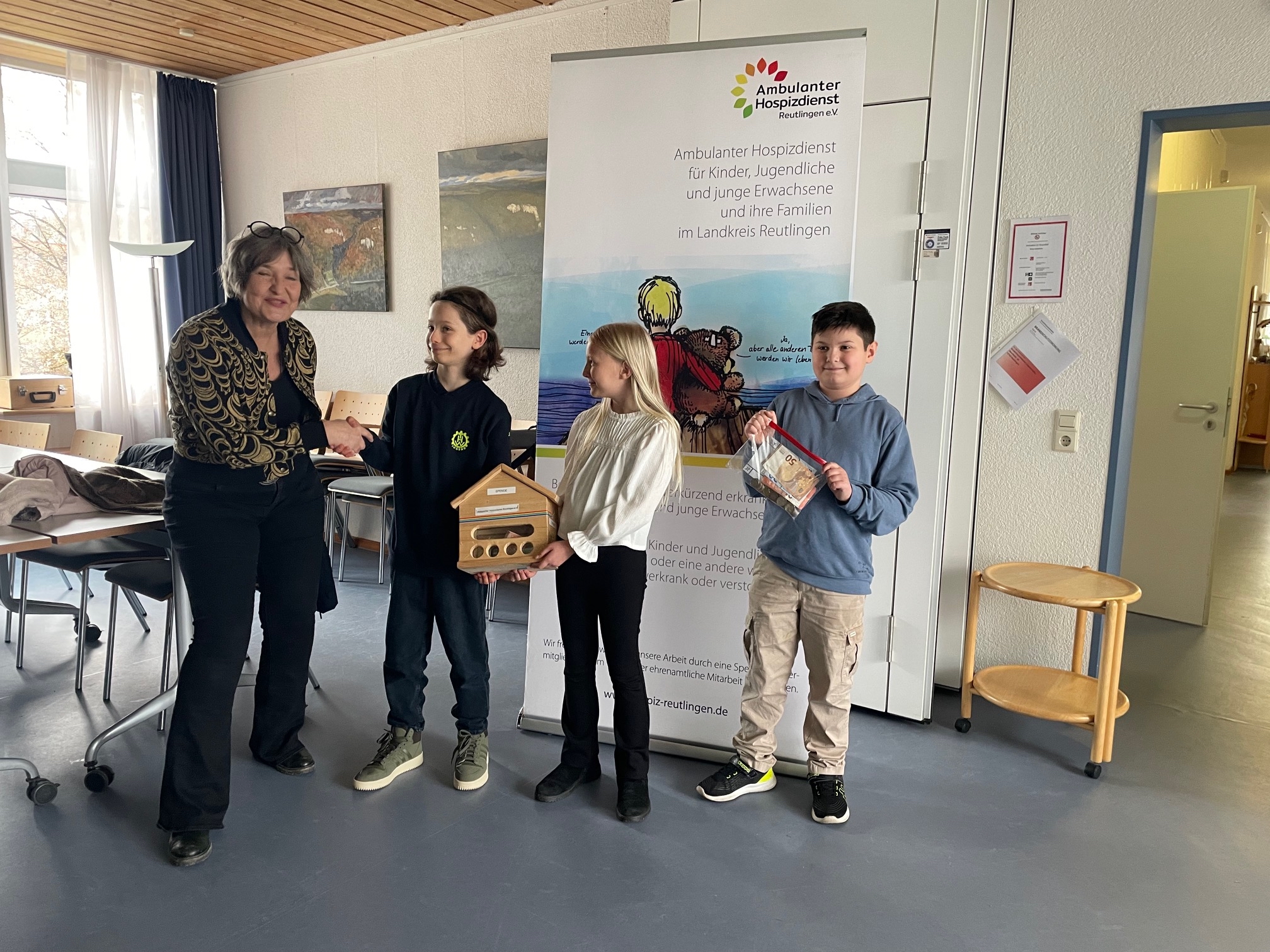 Am 17.12.2025 hatte die Klasse 4c einen Stand auf dem Reutlinger Weihnachtsmarkt an der Marienkirche. Wir verkauften: Waffeln, Donuts, Espresso, Kinderpunsch und Weihnachtsdekoration. Einige Kinder liefen über den Weihnachtsmarkt, machten Werbung für unseren Stand und verkauften Kleinigkeiten. Wir waren von 10:00 Uhr bis 20:00 Uhr auf dem Weihnachtsmarkt und nahmen dabei c.a. 715,00€ ein. Die Hälfte ging an das Kinder- und Jugendhospiz Reutlingen. Dort übergaben wir das Geld an Frau Leonard. Die andere Hälfte ging an unsere Klassenkasse. Das Kinder- und Jugendhospiz setzt sich für schwerkranke Kinder und deren Familien ein und unternimmt Ausflüge mit ihnen. Wir freuen uns, die Arbeit des Hospizes mit unseren Einnahmen unterstützen zu können.