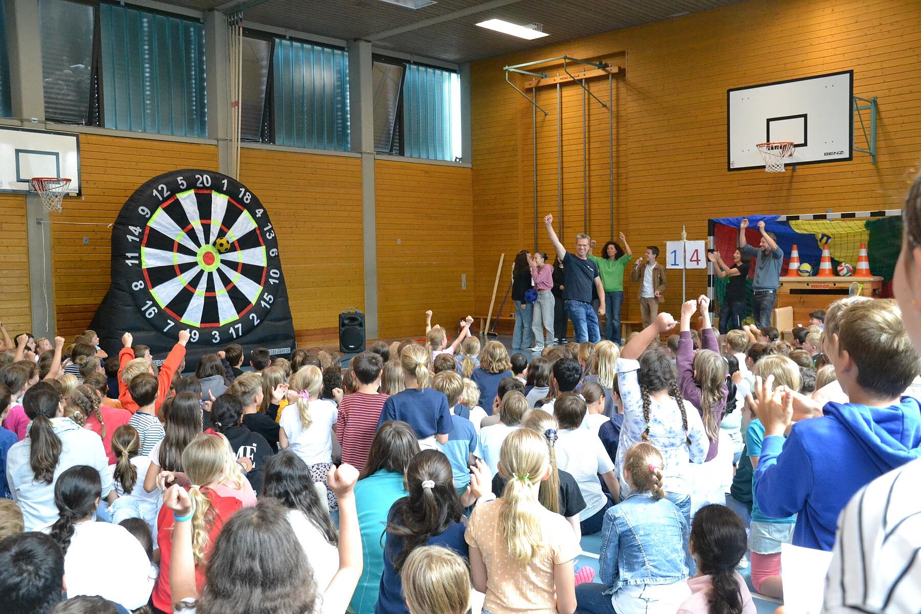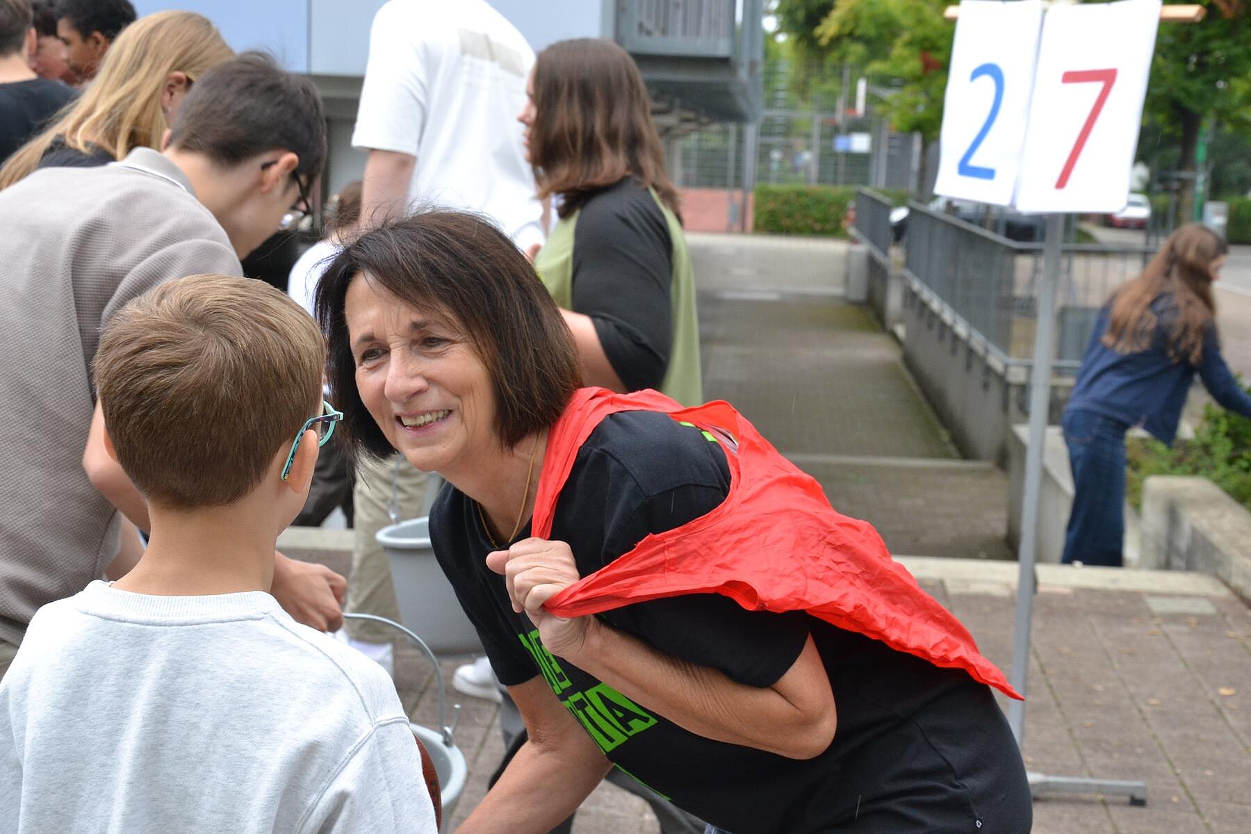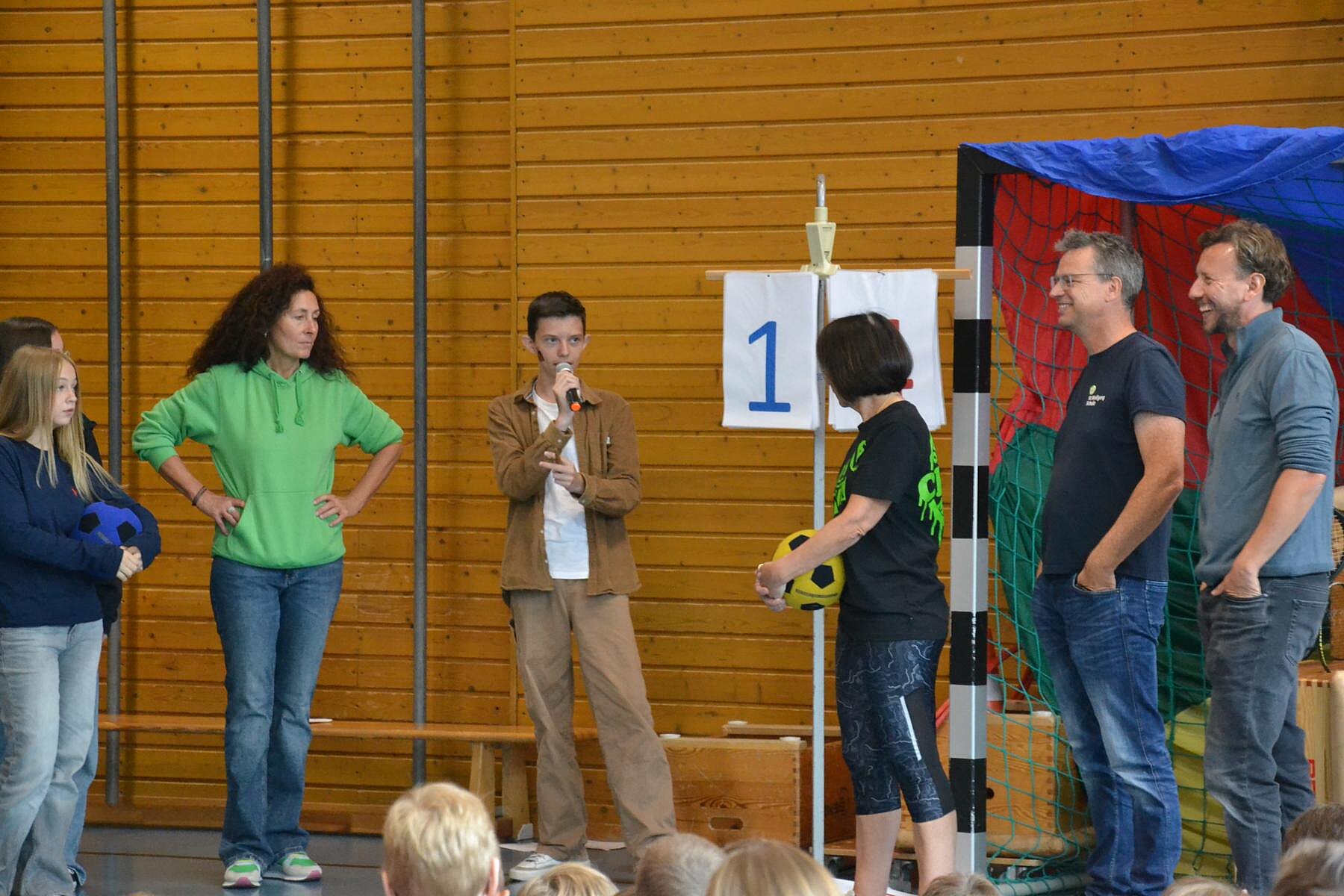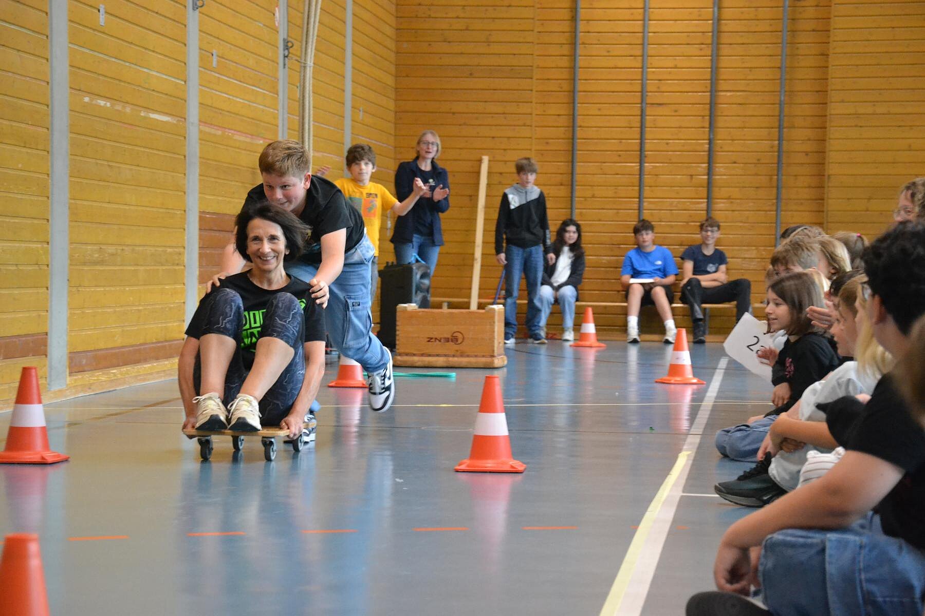 In der Schule trafen wir uns alle in der Sporthalle. Jede Klassenstufe hatte sich eine Wettkampfdisziplin überlegt, in der sie Frau Scheurer schlagen wollten. Frau Scheurer nahm die zehn verschiedenen Herausforderungen an. Für jedes Spiel durfte sie sich Kolleg*innen zur Unterstützung aussuchen. Den „Wettkampf“ moderierten wir Schüler. Am Ende gewann Frau Scheurer mit Unterstützung ihrer Kolleg*innen mit 8:2!