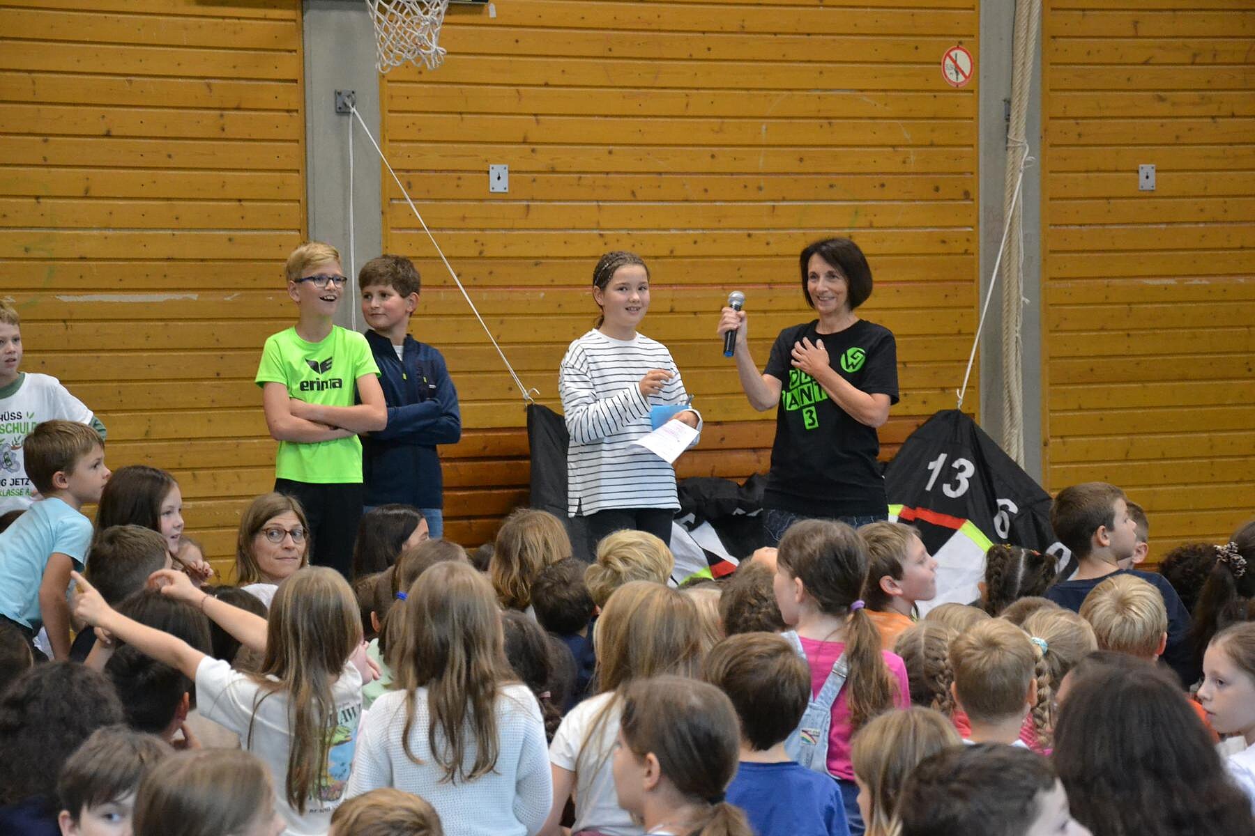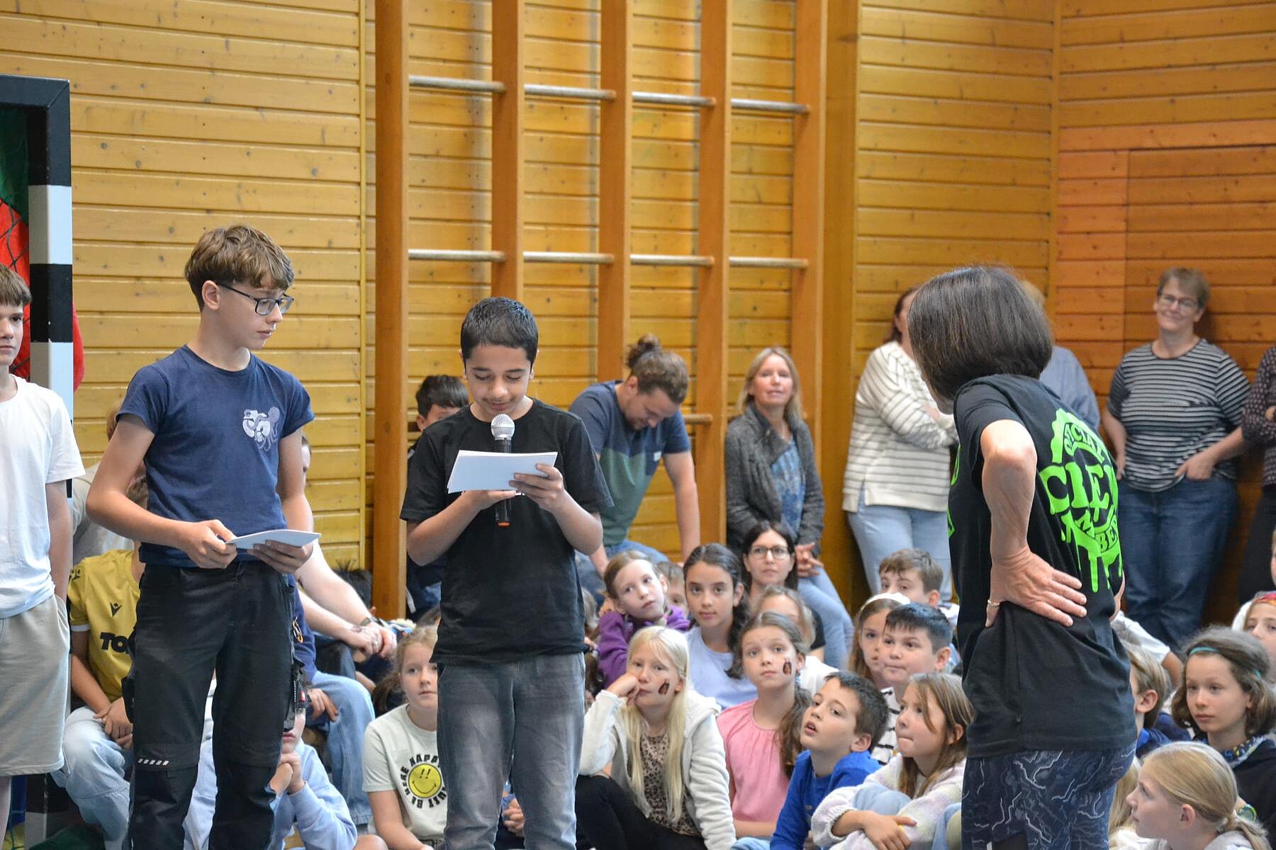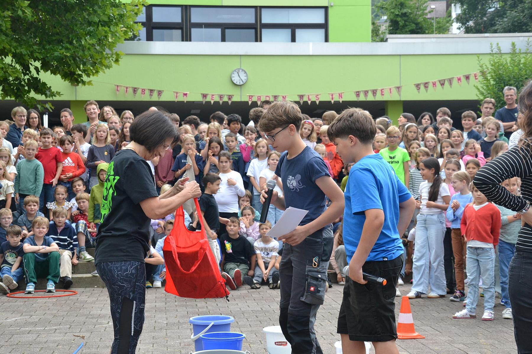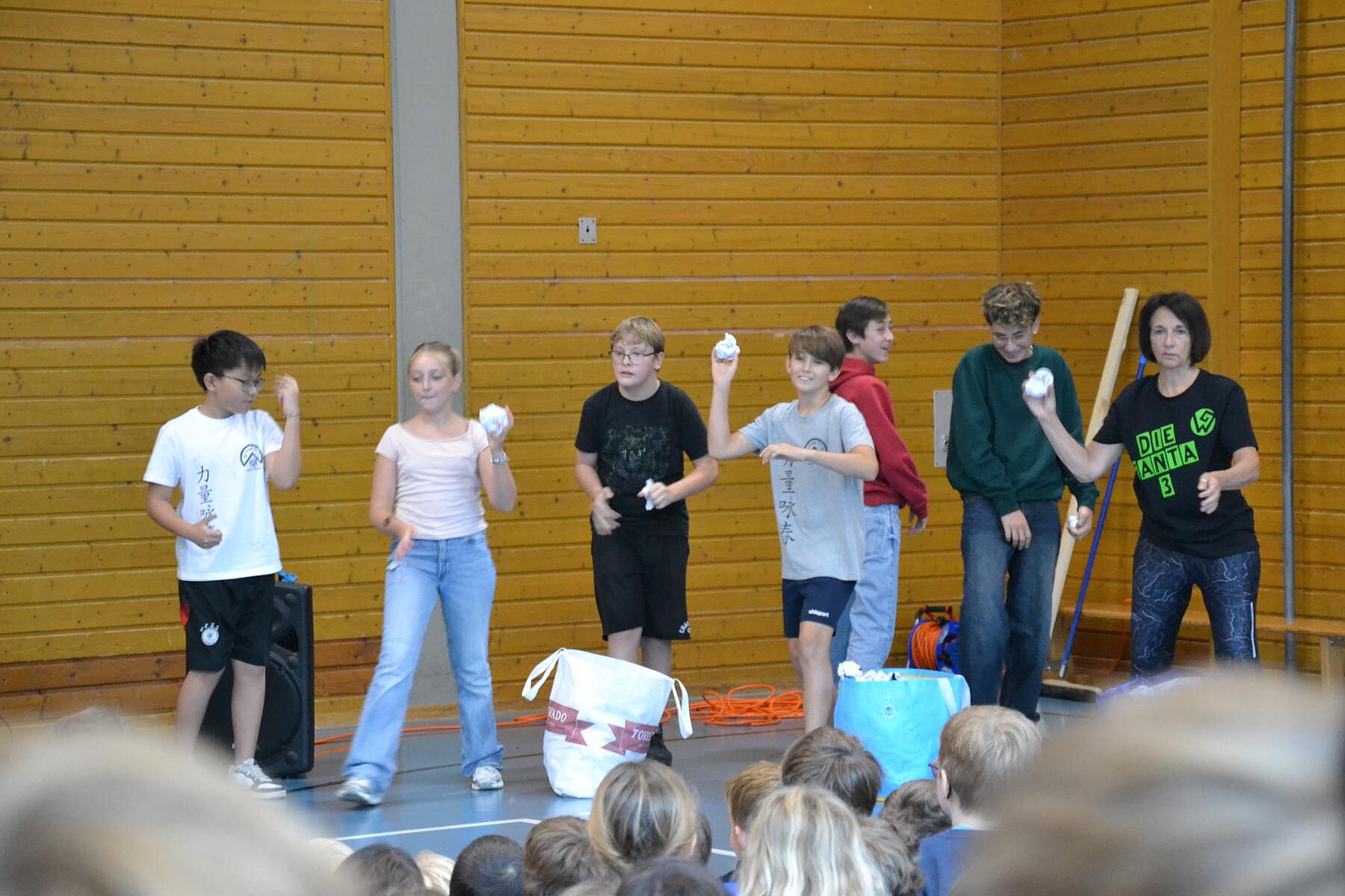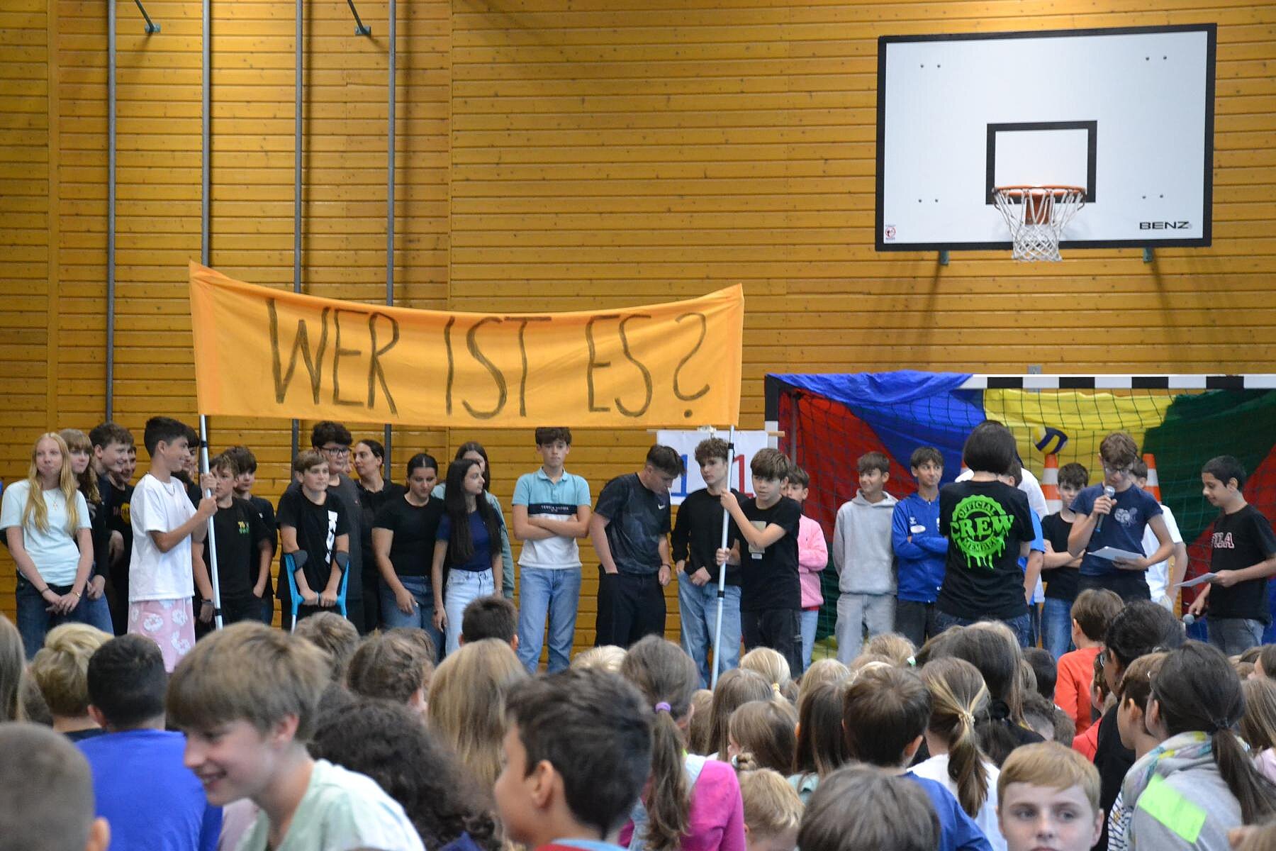 In der Schule trafen wir uns alle in der Sporthalle. Jede Klassenstufe hatte sich eine Wettkampfdisziplin überlegt, in der sie Frau Scheurer schlagen wollten. Frau Scheurer nahm die zehn verschiedenen Herausforderungen an. Für jedes Spiel durfte sie sich Kolleg*innen zur Unterstützung aussuchen. Den „Wettkampf“ moderierten wir Schüler. Am Ende gewann Frau Scheurer mit Unterstützung ihrer Kolleg*innen mit 8:2!