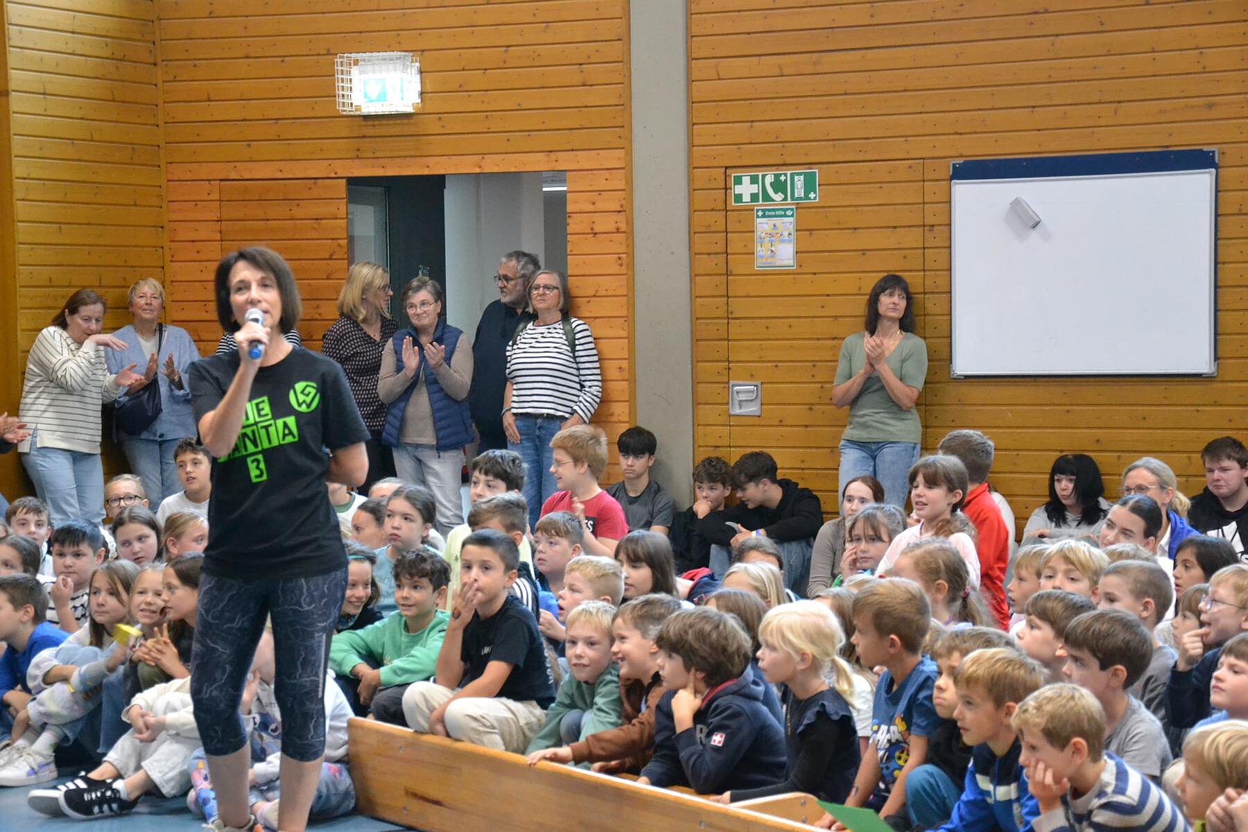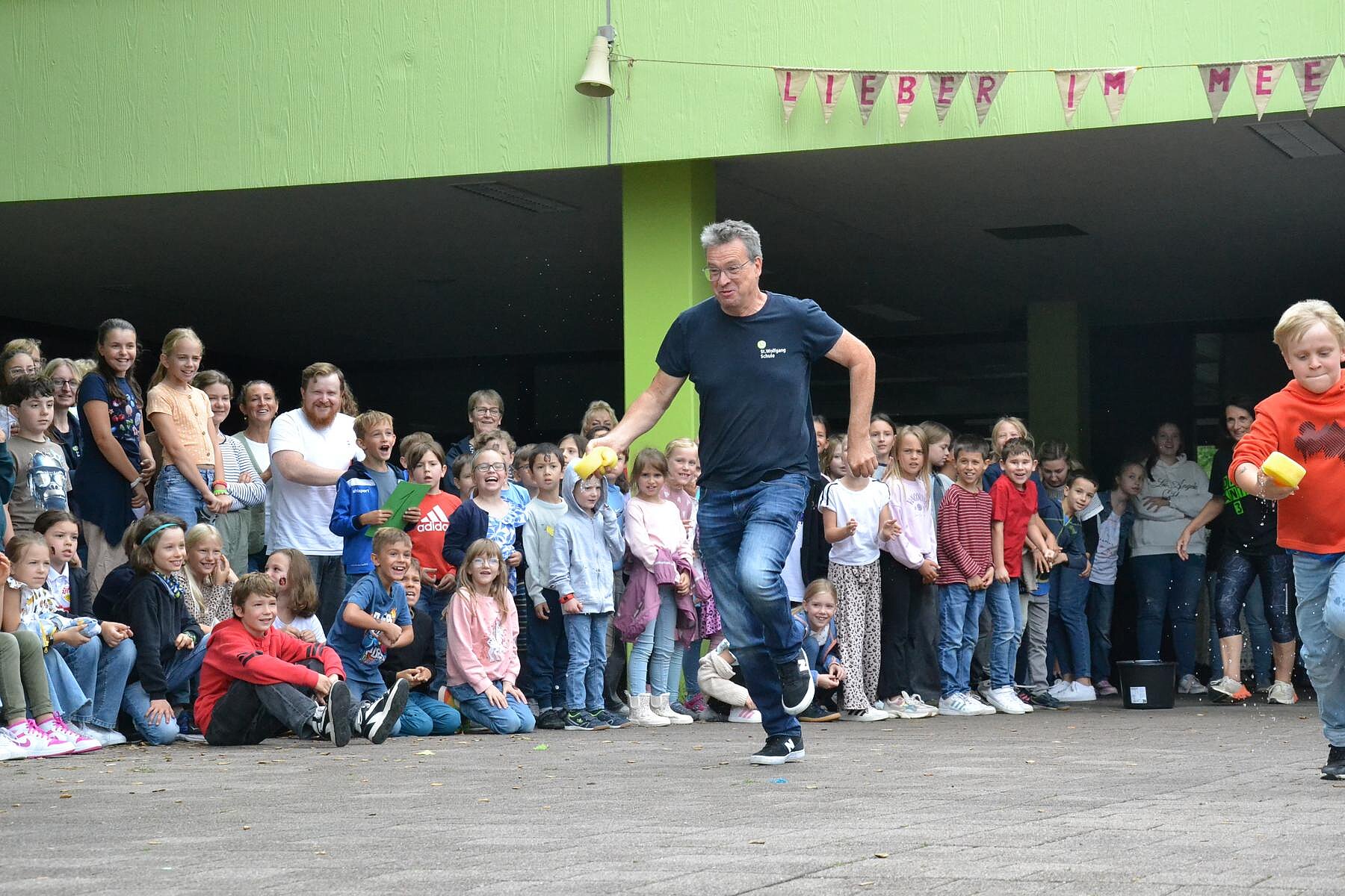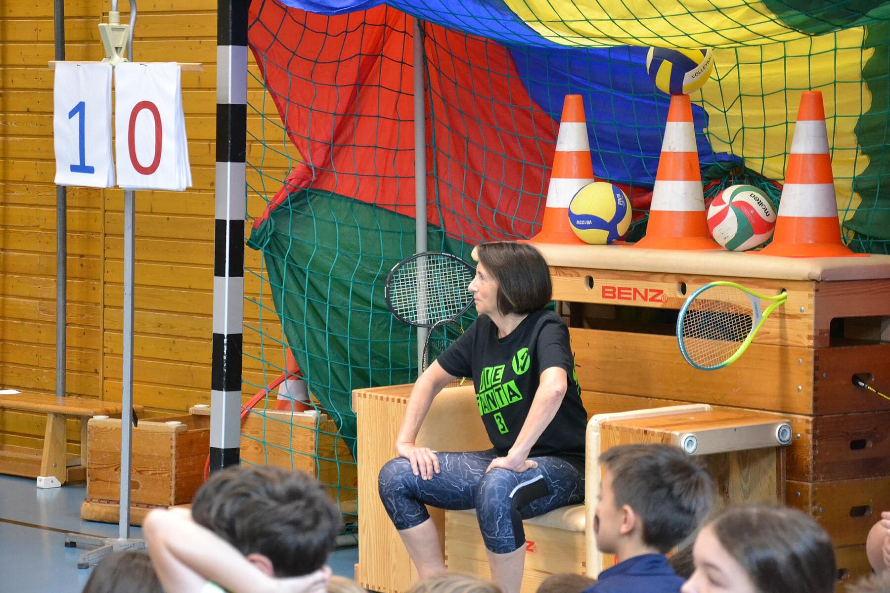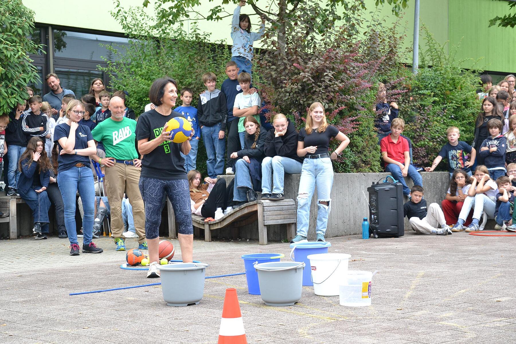 In der Schule trafen wir uns alle in der Sporthalle. Jede Klassenstufe hatte sich eine Wettkampfdisziplin überlegt, in der sie Frau Scheurer schlagen wollten. Frau Scheurer nahm die zehn verschiedenen Herausforderungen an. Für jedes Spiel durfte sie sich Kolleg*innen zur Unterstützung aussuchen. Den „Wettkampf“ moderierten wir Schüler. Am Ende gewann Frau Scheurer mit Unterstützung ihrer Kolleg*innen mit 8:2!