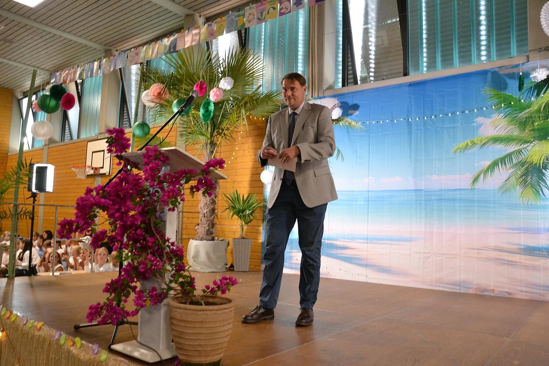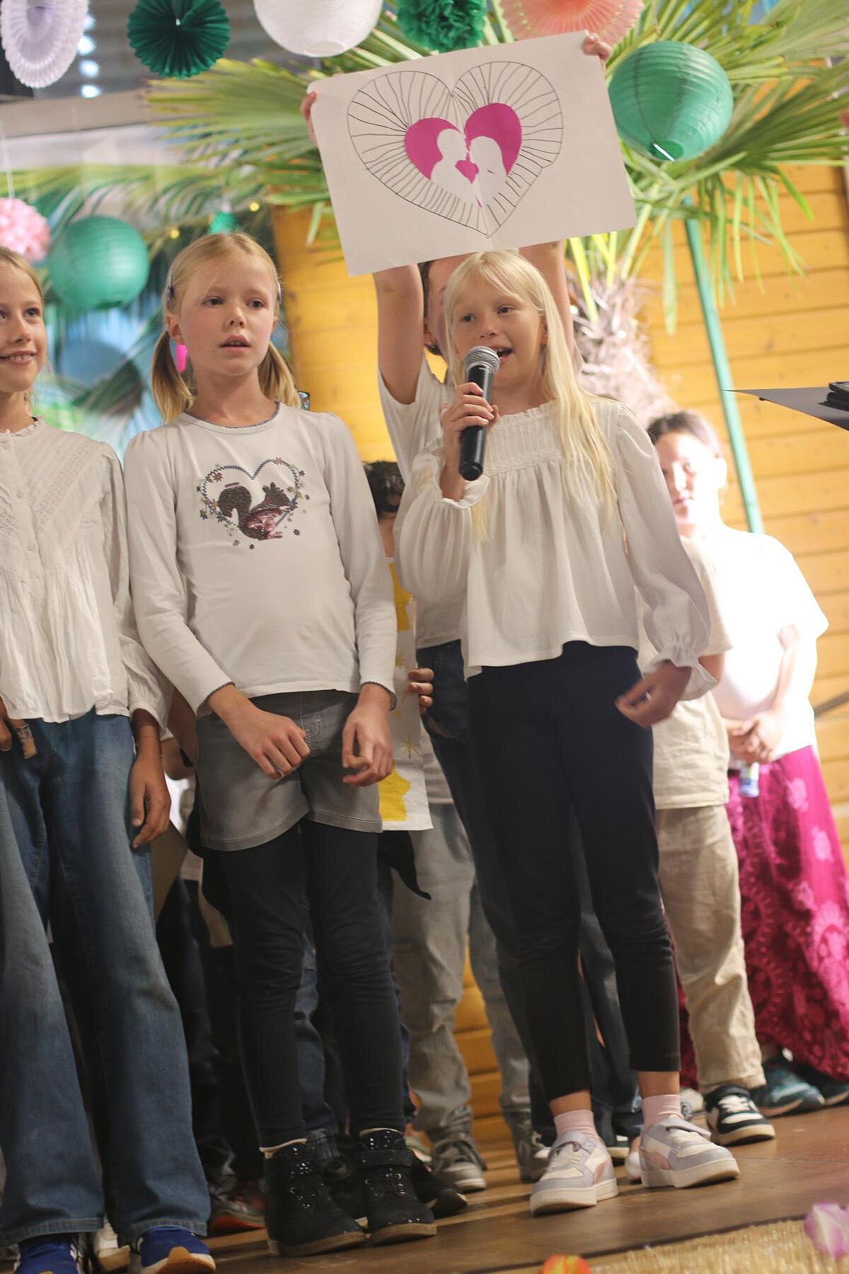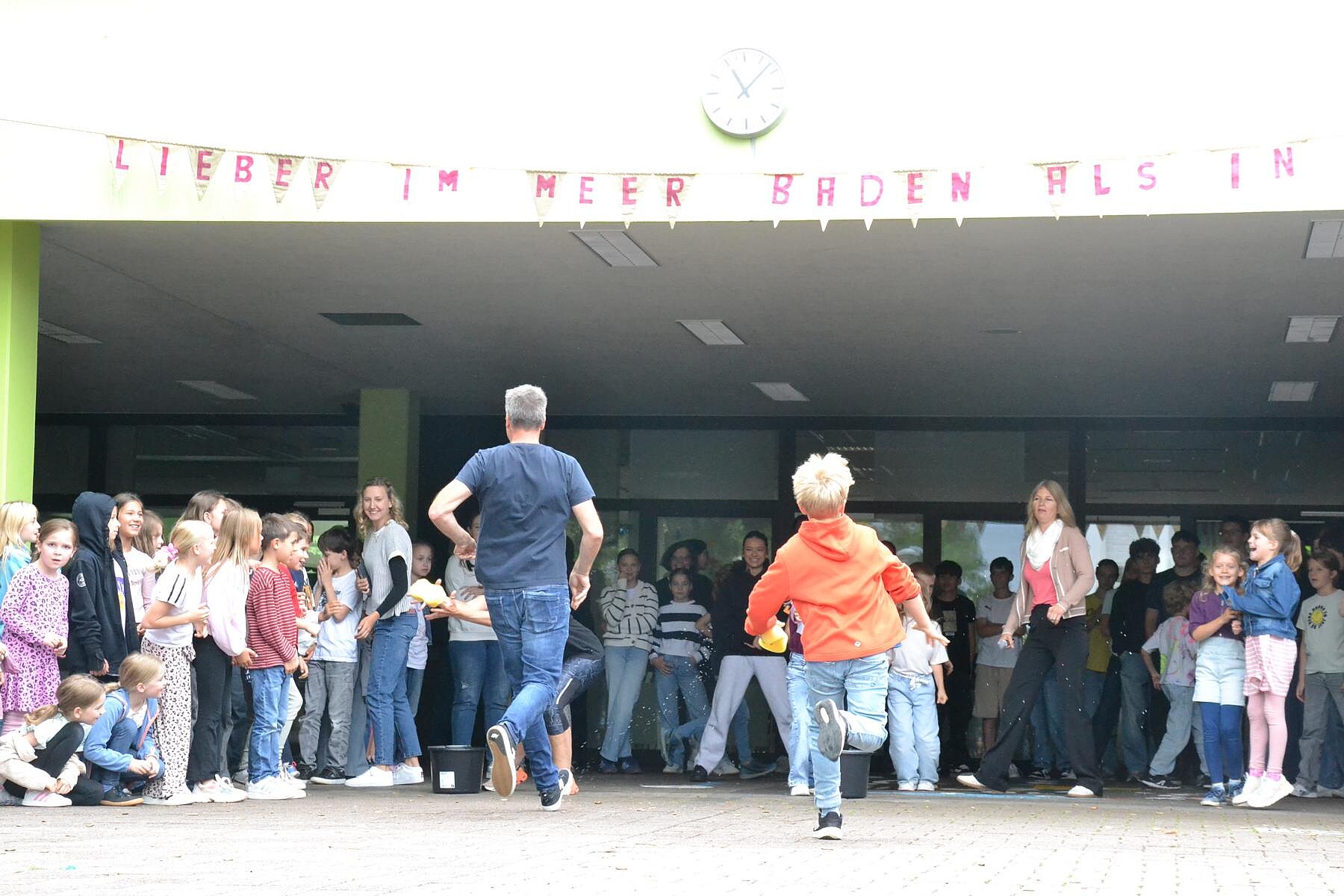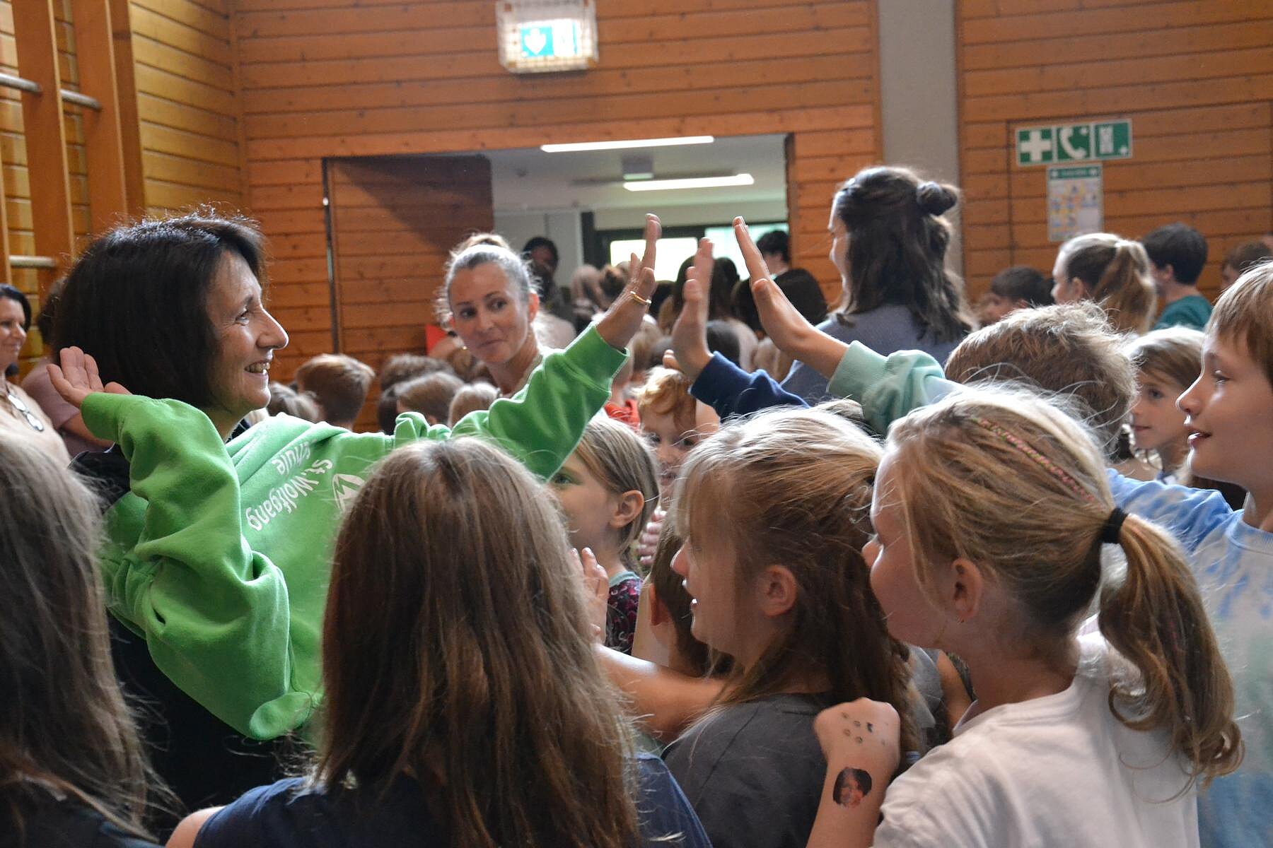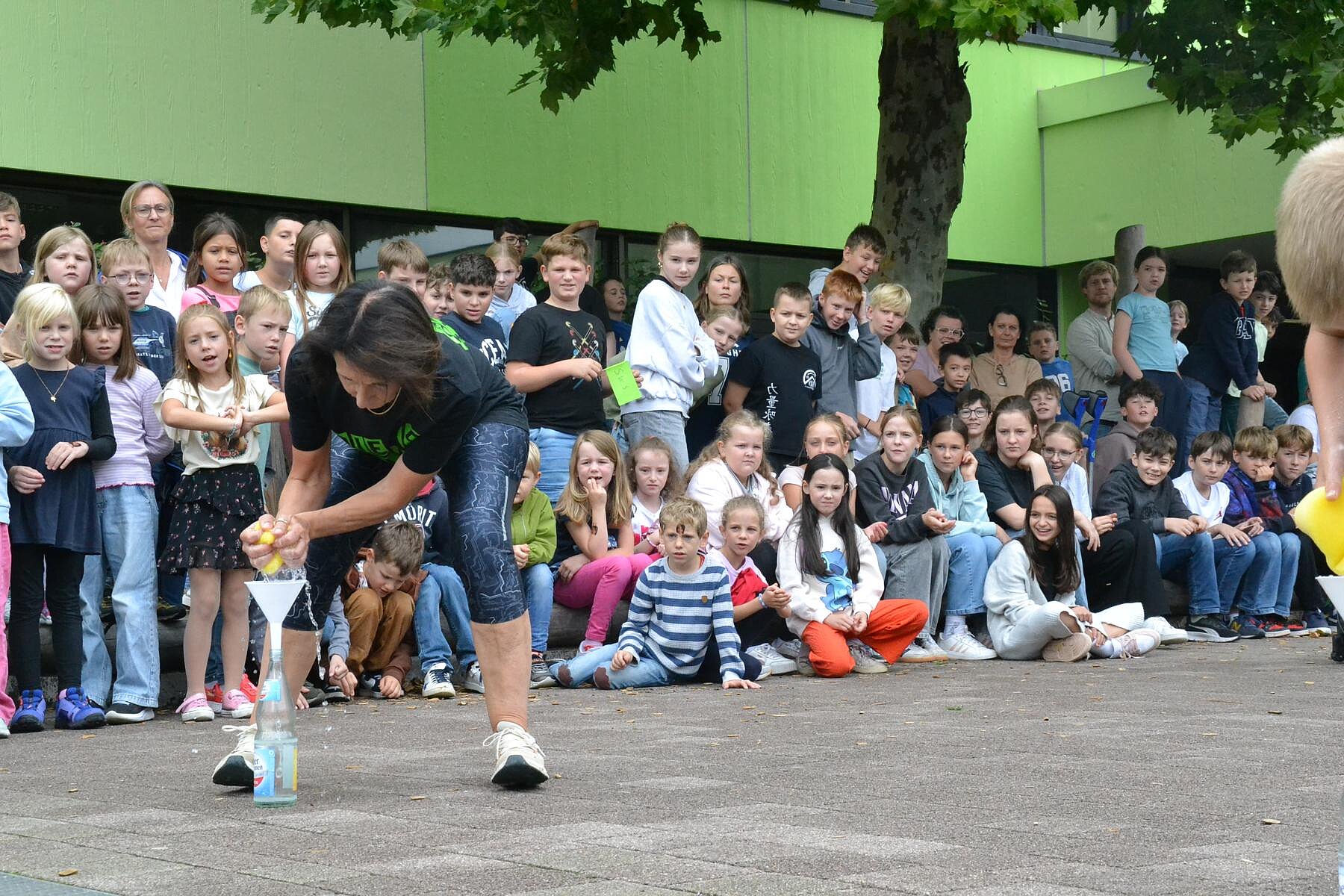 In der Schule trafen wir uns alle in der Sporthalle. Jede Klassenstufe hatte sich eine Wettkampfdisziplin überlegt, in der sie Frau Scheurer schlagen wollten. Frau Scheurer nahm die zehn verschiedenen Herausforderungen an. Für jedes Spiel durfte sie sich Kolleg*innen zur Unterstützung aussuchen. Den „Wettkampf“ moderierten wir Schüler. Am Ende gewann Frau Scheurer mit Unterstützung ihrer Kolleg*innen mit 8:2!