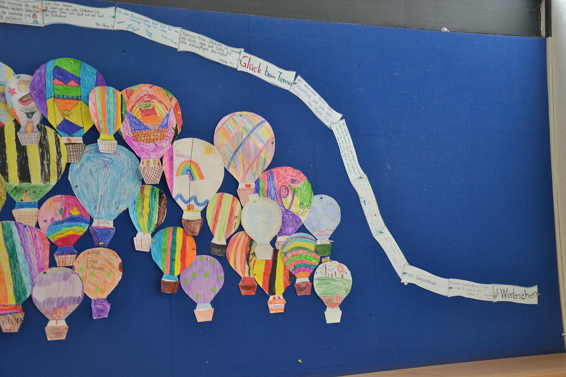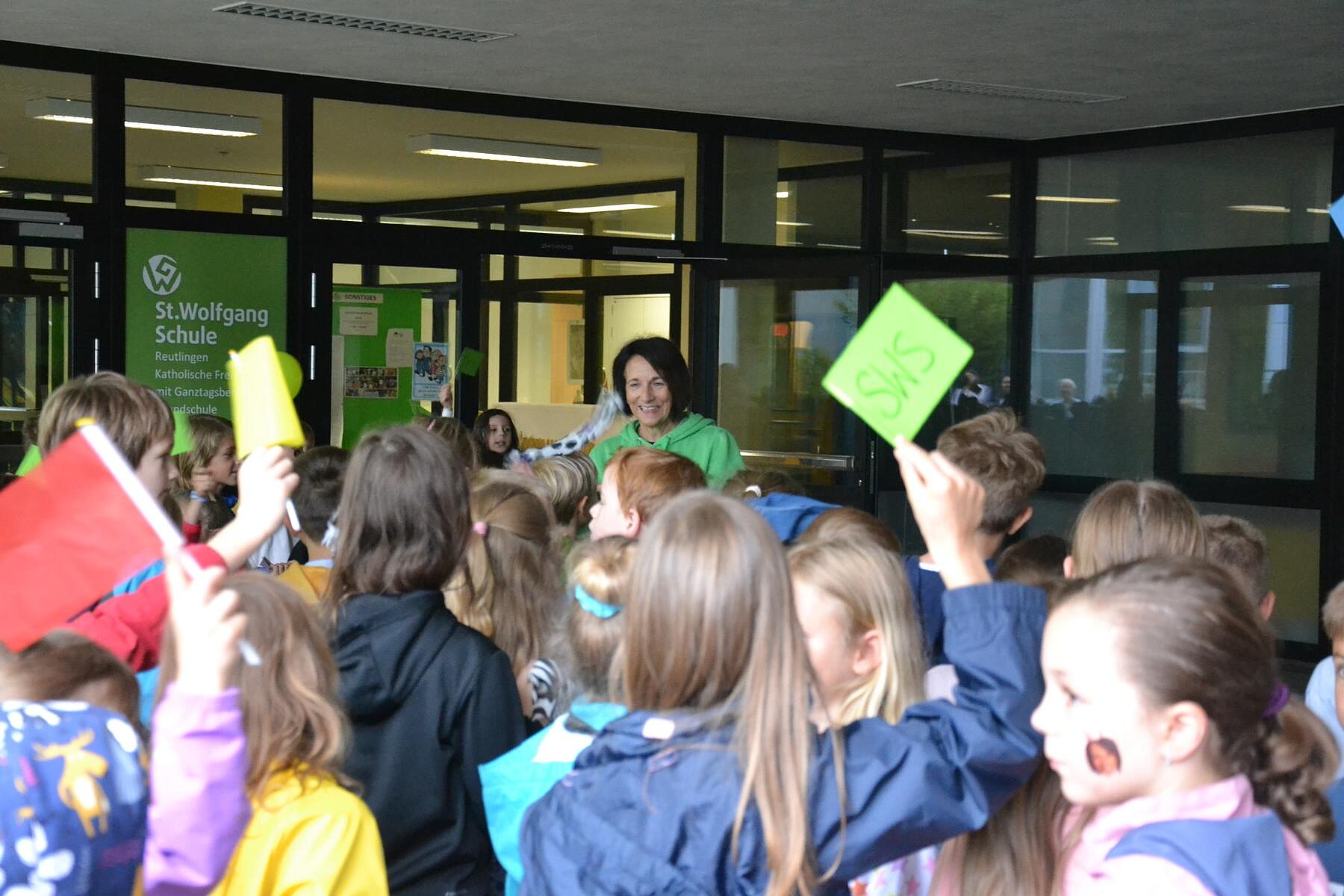 Zur Feier dieses Tages haben wir Frau Scheurer mit einer Fahrradrikscha von zu Hause abgeholt. Damit die Fahrt richtig stimmungsvoll war, hatten wir (alle Mitarbeitenden und Schüler*innen) uns mit Plakaten und Transparenten an die Straße gestellt. Unter riesigem Jubel durfte Frau Scheurer dann durch das Schülerspalier in die Schule fahren.